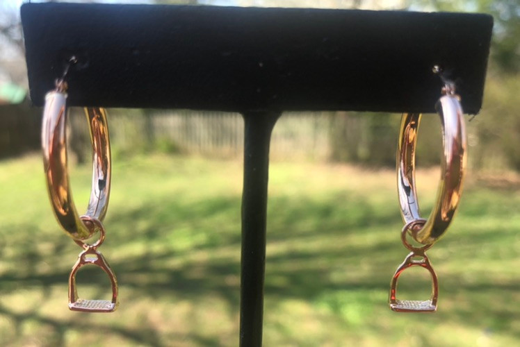 Loading... Please wait...These swingy hoop earrings are cute and have a sweet English stirrup dangle. They are available in sterling silver and all the gold metals. Pictured are the ones in rose gold a very popular metal. Please call 8593330458 with questions.