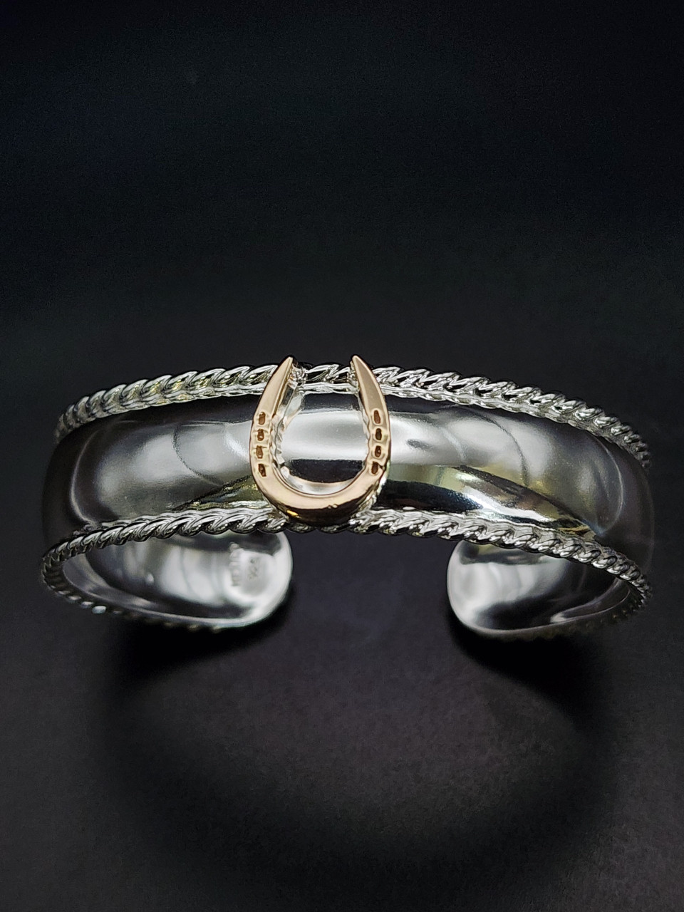 A 14k gold horseshoe soldiered on a sterling silver cuff bracelet. The cuff features a roping detail on the edge. Can be customized.