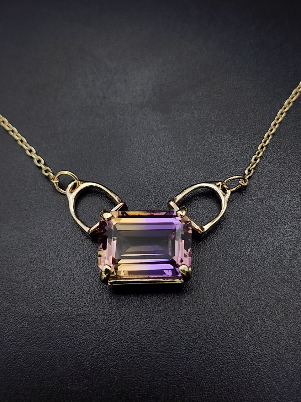 A beautiful ametrine set in 14k gold with stirrup bails. The chains 18 inches long and is a 1.5 cable chain. This is a AAA stone.