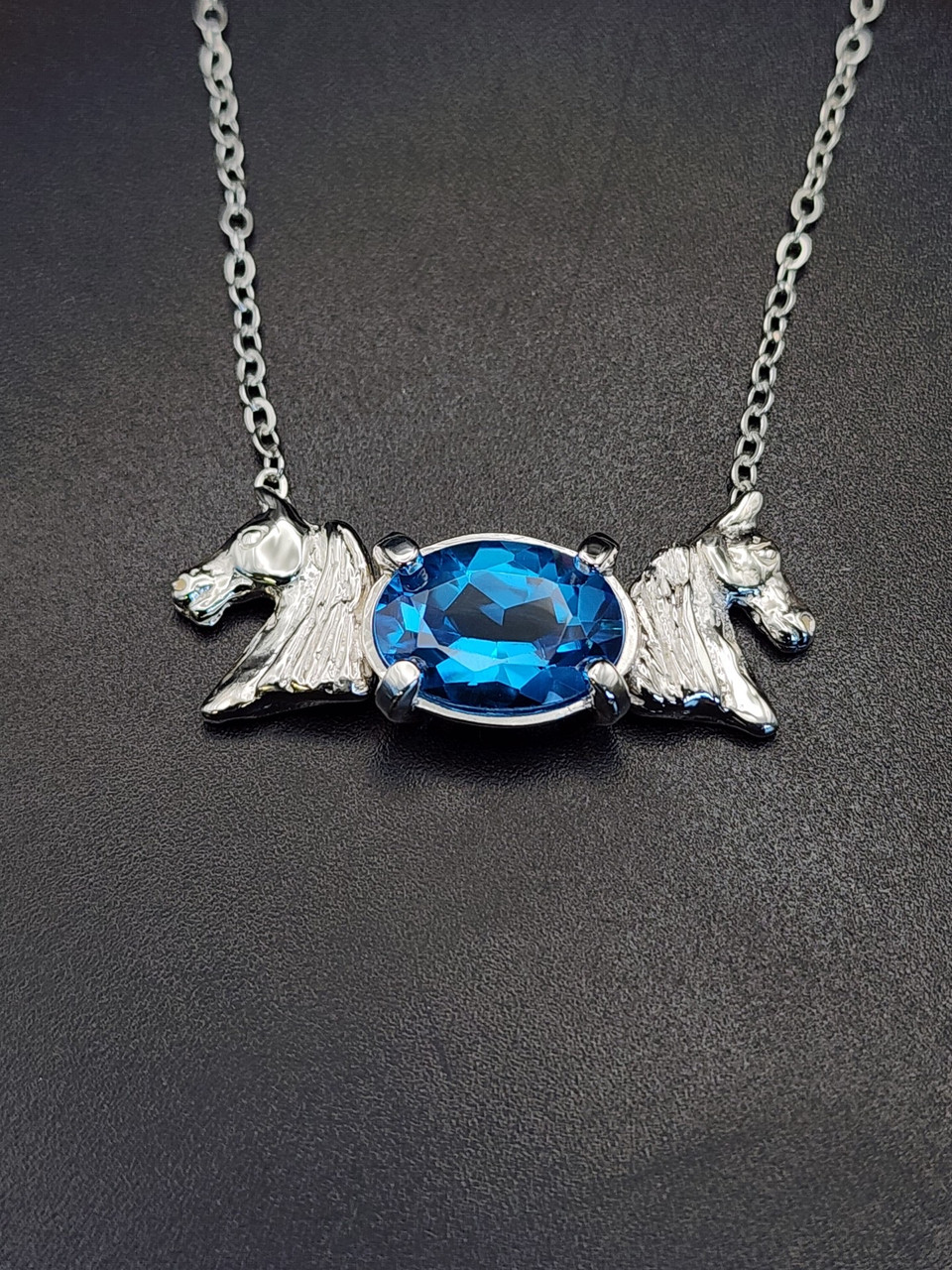 A sterling silver horse heads necklace with a oval Swiss blue topaz. The chain is 18-inches long. This makes a beautiful statement piece.