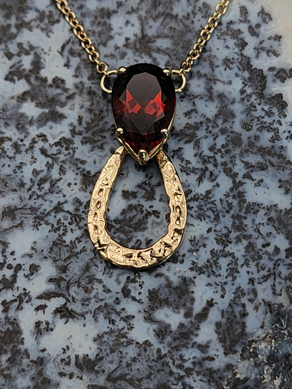 A beautiful 14k gold hammered horseshoe with a pear-shaped madeira citrine. The chain is 18-inches long. The citrine is an orange red gemstone and is AAA.