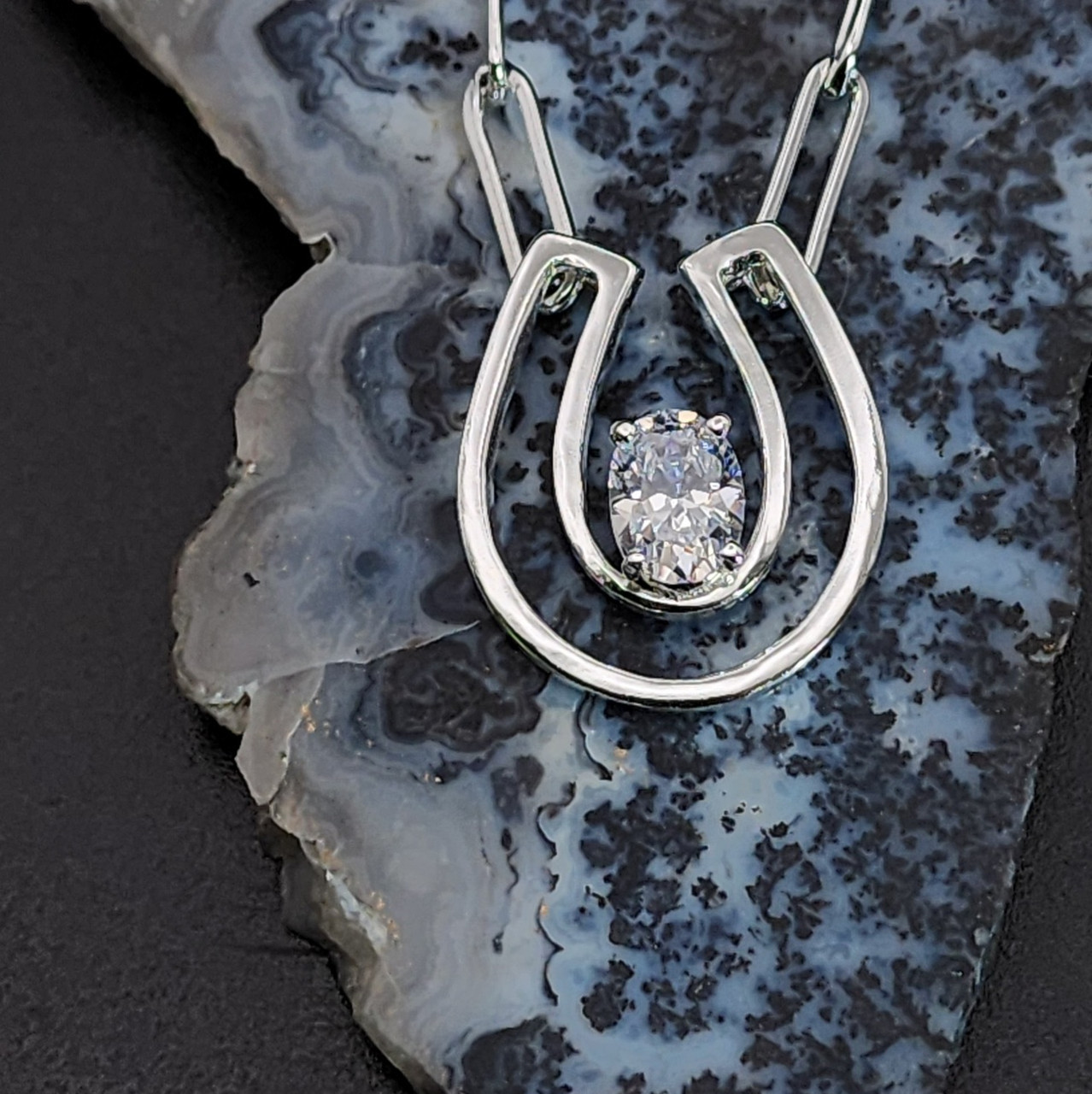 Loading... Please wait...This necklace is made in sterling silver or can be in gold. Price depends on type of metal and gemstone choose. This necklace is pictured with a sapphire or a cubic zirconium. This necklace can be done in 14K gold and paved in diamonds with any chain. We are featuring a paper clip chain . Call to create your custom piece.8593330458.