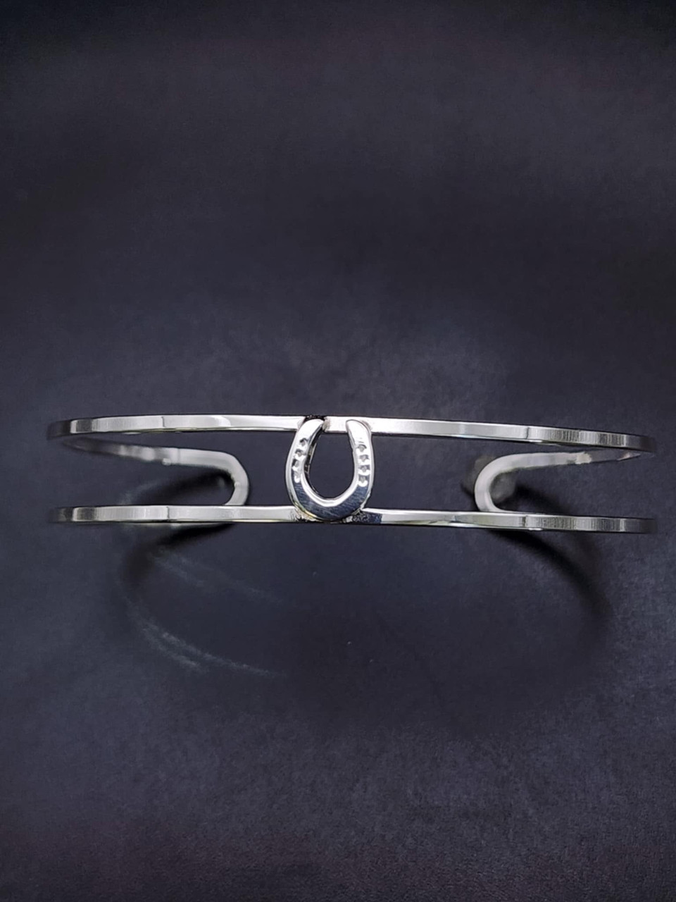 A delicate addition to your wardrobe to fit your equestrian style. A Sterling silver cuff featuring a sterling silver horse shoe!
