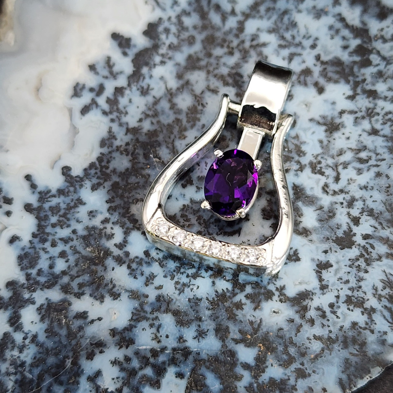 Loading... Please wait...A western stirrup in sterling silver featuring a deep purple AAA amethyst in the middle. This piece has on the lower border of the stirrup a line of cz to give it that extra bling. A row or hearts line the side of this special stirrup.